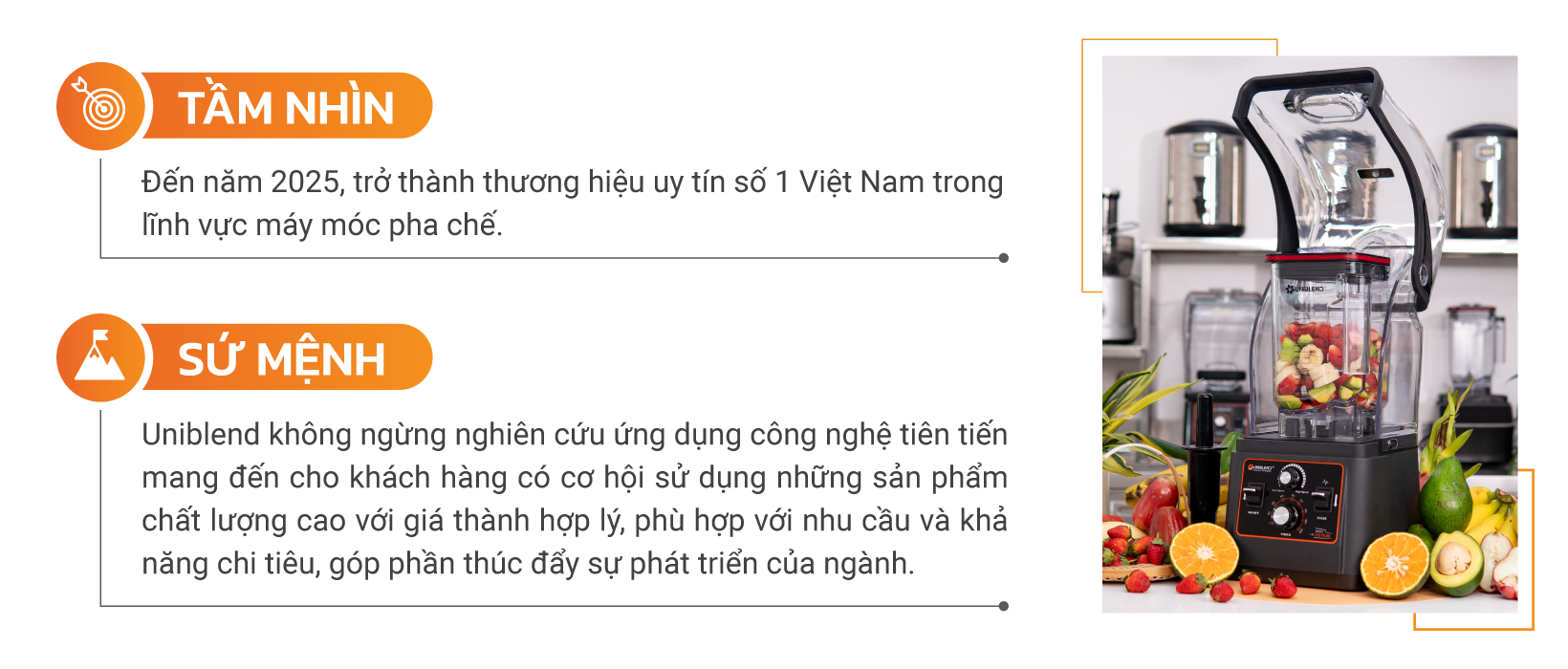 Với đội ngũ lãnh đạo trẻ, luôn tập trung phát triển nhân tài nhằm tạo ra đội ngũ hùng hậu cho một thương hiệu vững bền trên thị trường. Uniblend luôn không ngừng nghiên cứu, phát triển các sản phẩm máy móc cho ngành pha chế tiên tiến nhất.